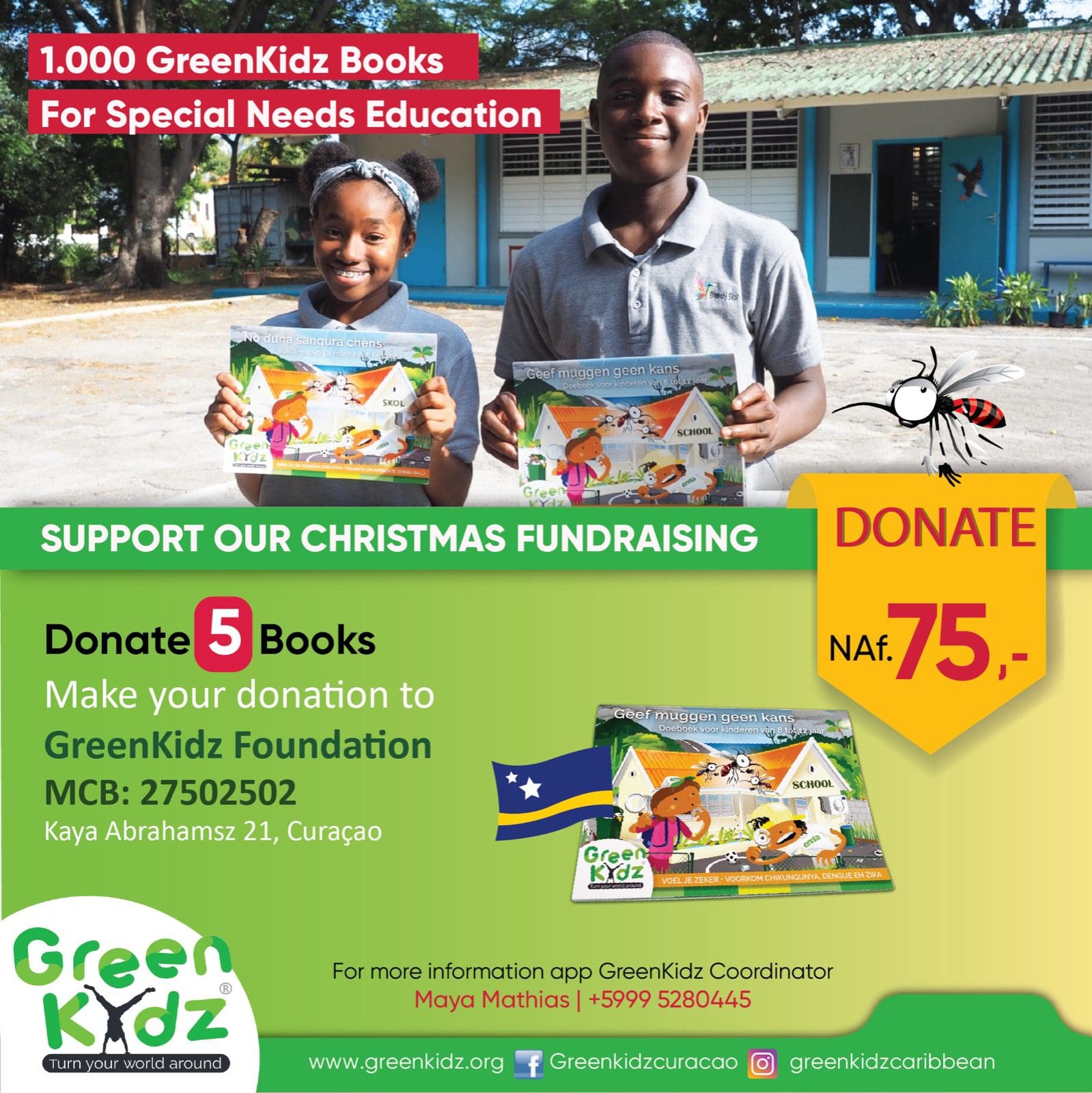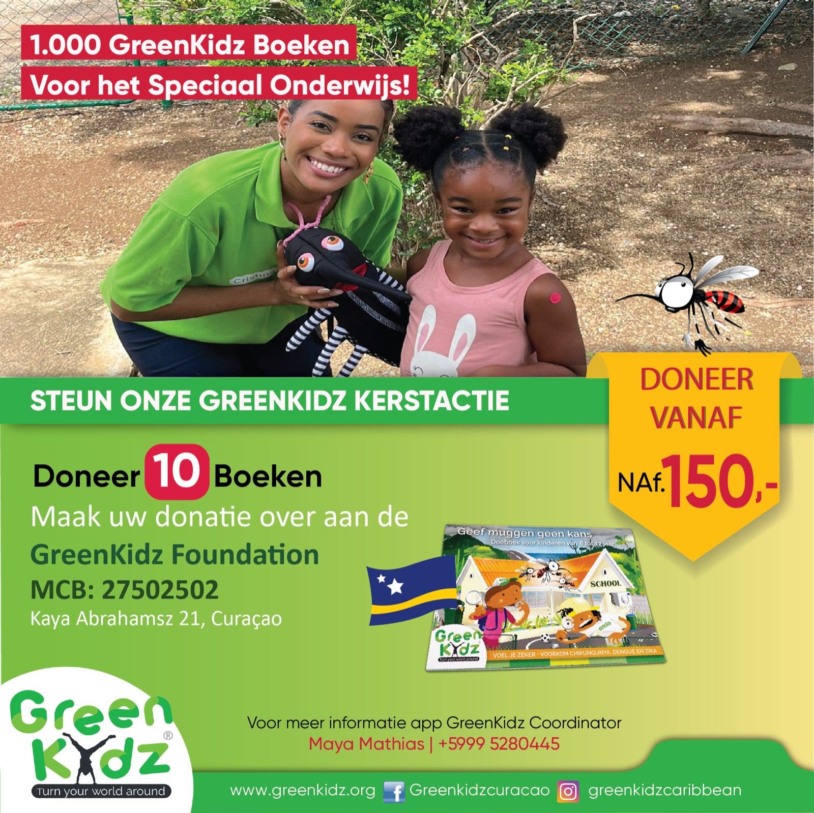 With your help, we can make 1,000 special education students happy by gifting them a colorful mosquito prevention activity book full of coloring pages and games. You can help us by donating to the Greenkidz Foundation, MCB 27502502. Kaya Abrahamsz 21, Curacao
