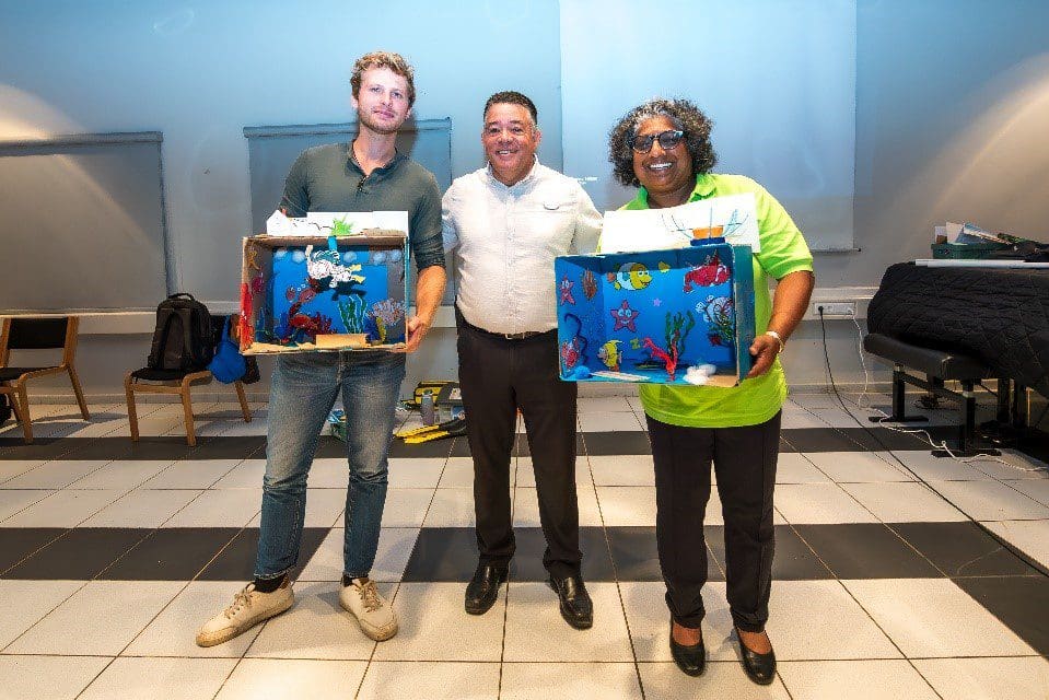 Thirty students from grades 4, 5, and 6 participated in various activities to learn more about the coral reef of Curacao and how to enjoy it responsibly. Students engaged in interactive presentations, games, and a creative task where they made a diorama of the reef and the various plants, animals, and fish that live there.