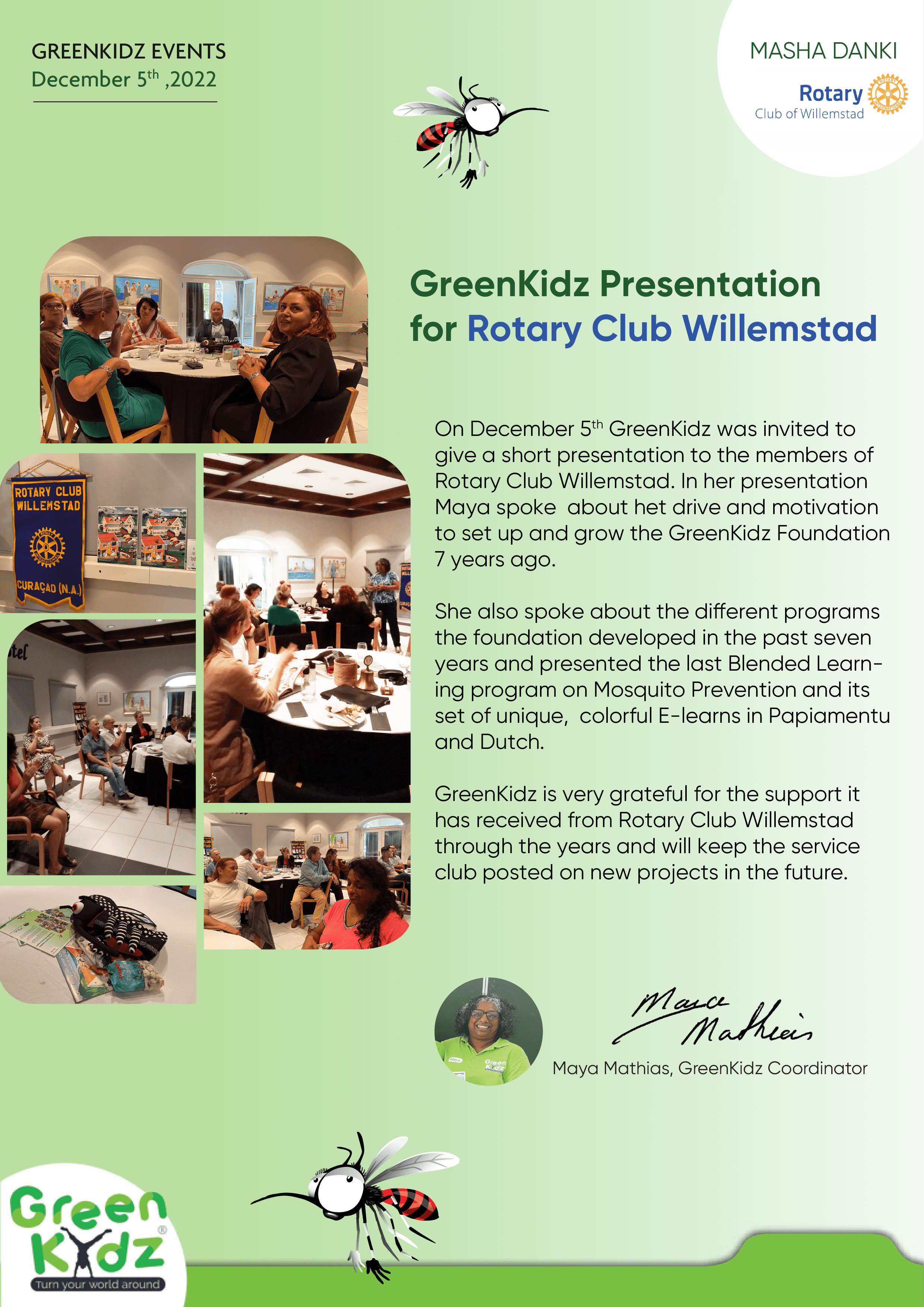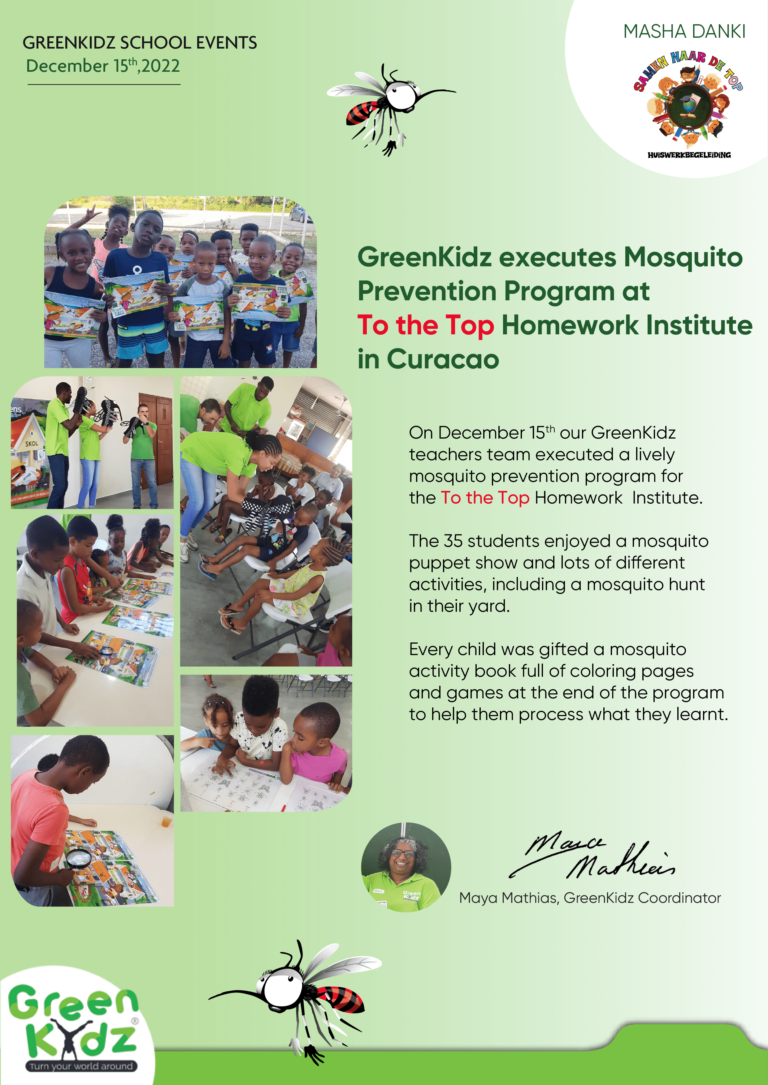 2022 GreenKidz Mosquito Prevention Event for To the Top Homework institute, December 2022 GreenKidz Working Trip to Sint Eustatius, December 2022 GreenKidz Presentation for Rotary Club Willemstad, December 2022 GreenKidz Meetup with Dutch Mosquito Research Team, November 2022 GreenKidz Mosquito Prevention Event at VSO ZMLK Marieta Alberto, November 2022 GreenKidz Bookweek Event at Mensing’s Caminada, November 2022 GreenKidz Mosquito Prevention Event at the Bellefaas Martis School, November 2022 GreenKidz Presentation for Curacao Lions Club, October 2022 GreenKidz Mosquito Prevention Event at Kidz First, October 2022 GreenKidz Recycle Event at Blenchi School, September 2022 GreenKidz Mosquito Prevention Event at Lionsdive Beach Resort, August 2022 GreenKidz Mosquito Prevention Community Event at Mensing’s Caminada, August 2022 GreenKidz Mosquito Prevention Try Outs at local schools in Curacao, June and July 2022 Kòrsou Limpi books for special education. 2022 2022 2021 Coral Heroes curriculum launch, 2021 2021 GreenKidz colouring books campaign, 2019 2019 GreenKidz working visit to Children’s Museum Curaçao, 2019 GreenKidz working visit to Carmabi, 2019 GreenKidz working visit to Limpi, 2019 GreenKidz activities 2015-2019 GreenKidz New Year collage 2020 2018 GreenTeens project, 2018-2019 2017 GreenKidz Rap Festival, 2017 2016 GreenKidz Annual collage, 2016 GreenKidz Clean Up project, 2016