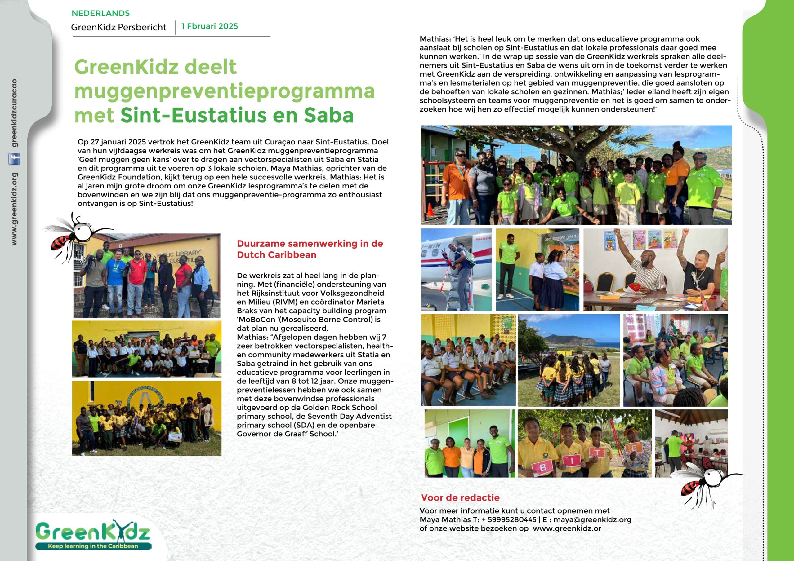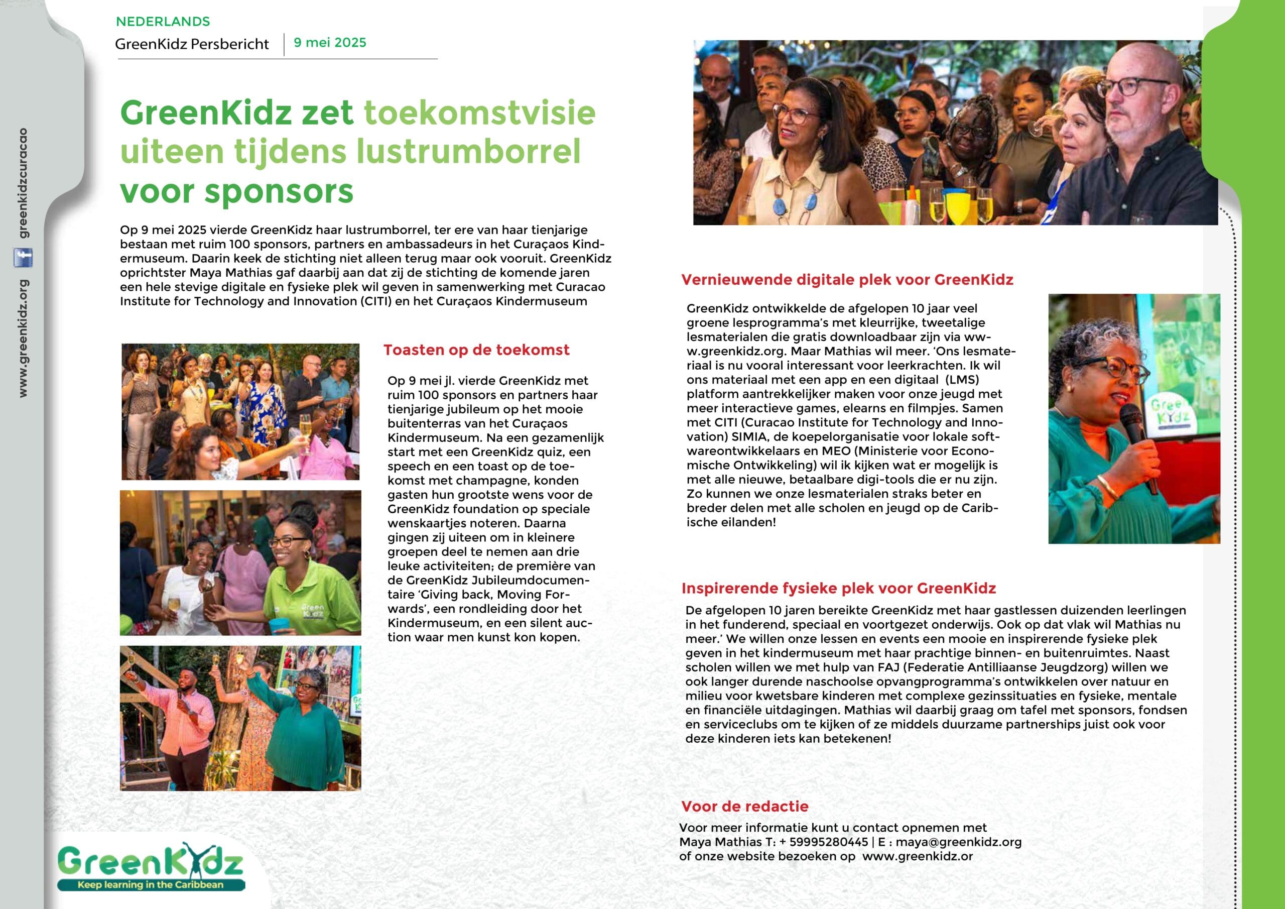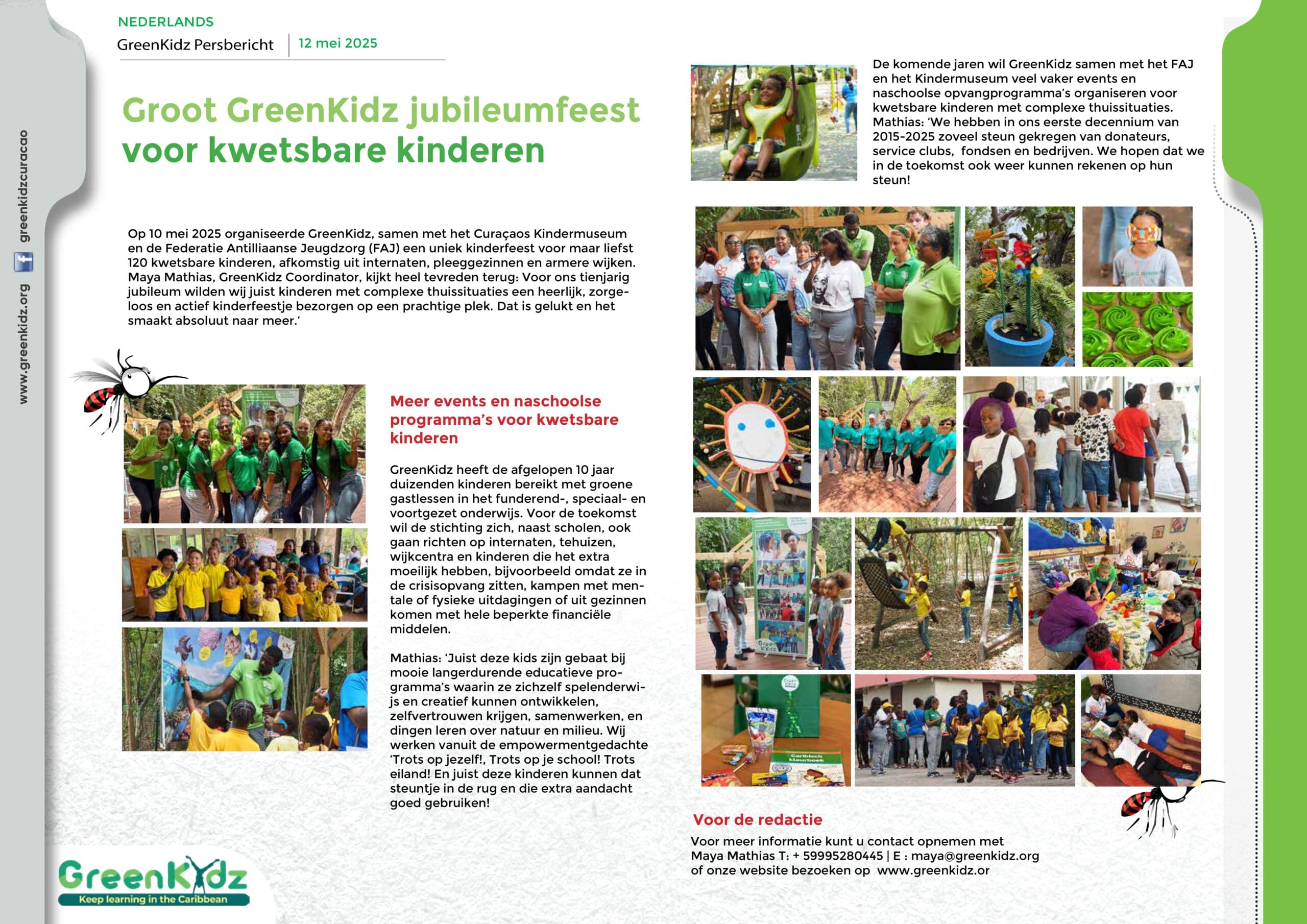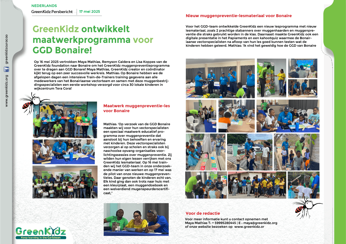 Persberichten GreenKidz ontwikkelt maatwerkprogramma voor CDG Bonaire, 2025 GreenKidz Persbericht Kinderfeest Kwetsbare Kinderen, 2025 GreenKidz Persbericht Jubileumborrel en toekomstvisie, 2025 GreenKidz Werkreis naar Sint Eustatius, 2025 GreenKidz deelt programma’s met ABC eilanden, 2024 GreenKidz geeft Duizend Caribische Kleurboeken weg, 2024 GreenKidz ta reparti Mil Buki di Kleur Pornada, 2024 Kliko Challenge Winnaars, 2024 GreenKidz ondersteunt Kliko Challenge project, 2024 GreenKidz en the Branch Coral Foundation organiseren een uitverkochte Coral Happy Hour!, 2024 Greenkidz start fundraising voor speciaal onderwijs, 2023 GreenKidz ta inisiá kampaña pa rekoudá fondo pa Skol Spesial, 2023 GreenKidz en Avila werken samen aan reef care awareness, 2023 GreenKidz wint twee prijzen in het voorjaar van 2023 Maya Mathias te gast bij koning Willem Alexander, 2023 GreenKidz lanceert Hofi Mango project voor scholen op Banda Bou, 2023 GreenKidz ta lansa projekto Hofi Mango pa skolnan di Banda Bou, 2023 Duizend GreenKidz muggen doeboeken voor speciaal onderwijs, 2023 Gratis GreenKidz lespakket voor alle scholen op Curaçao, 2022 Pakete di edukashon grátis di Greenkidz pa tur skol na Kòrsou, 2022 GreenKidz lanceert nieuw educatief programma ‘Muggenpreventie’, 2022 GreenKidz ta lansa programa edukativo nobo ‘Prevenshon di Sangura’, 2022 Duizend GreenKidz boeken voor het Speciaal Onderwijs, 2022 Opening Korsou Limpi Tentoonstelling Savonet Museum, 2021 Apertura di eksposishon pa mucha ‘Kòrsou Limpi’ den museo Savonet, 2021 Coral Heroes lespakket voor alle scholen op Curaçao, 2021 Lancering nieuwe GreenKidz website, 2020 Onthulling GreenKidz recycle muur, 2019 Lancering GreenKidz inheemse-bomen-project, 2019 Uitreiking Coca Cola donatie voor GreenTeens project, 2018 Uitreiking GreenTeachers Award, 2018 GreenKidz Kooyman Earthday Activiteitendag, April 2018 GreenKidz World Without Waste Workshop voor Curacaos Jeugdparlement, December 2018 Lancering EWT lespakket ‘Iedereen een handen-was-kampioen’, Oktober 2017 Uitreiking GreenKidz Award tijds Rapfeest, Juni 2017 Presentatie GreenKidz jaarverslag aan Minister President Eugene Ruggenaath, Mei 2017 Tooby filmvoorstelling; een lokale tweetalige animatiefilm over rommel opruimen, April 2016 Lancering Lespakket Plastic & Recyclen voor het Funderend Onderwijs van Curacao, November 2015