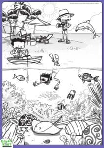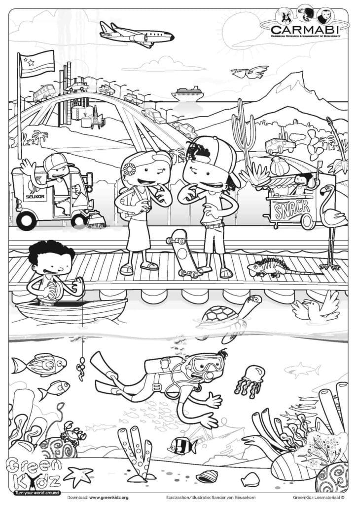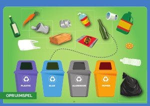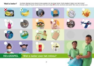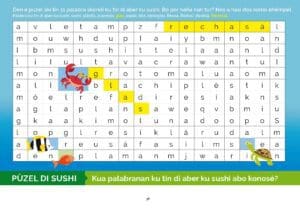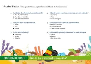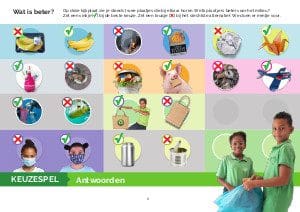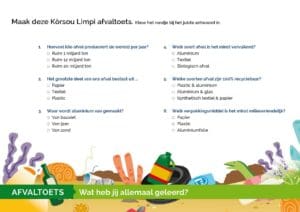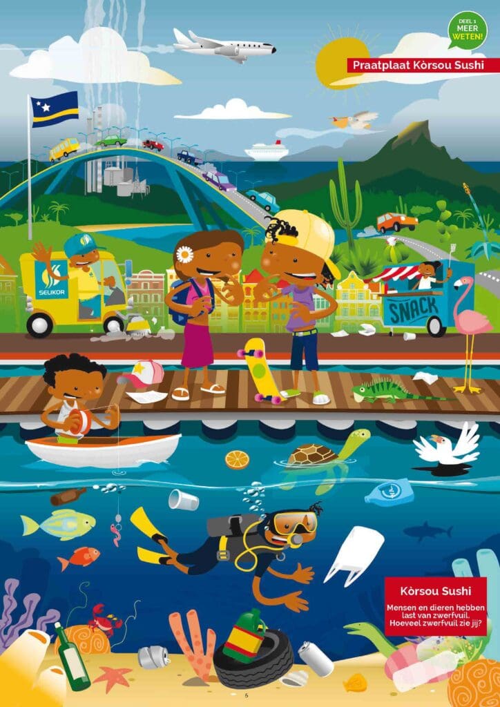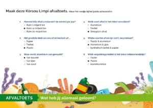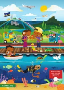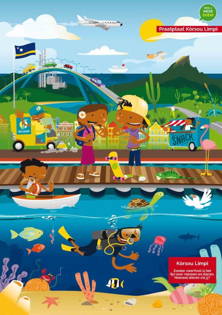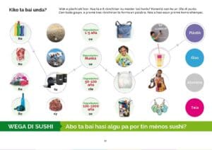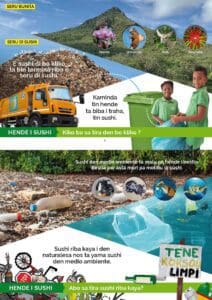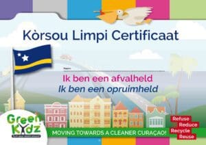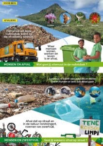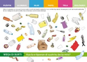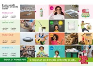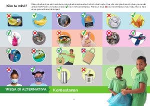The teaching material that accompanies this program consists of a colourful discussion book, a number of beautiful picture slides and colouring pages, a number of loose reading sheets, games, puzzles and a Kòrsou Limpi waste test and student certificate.